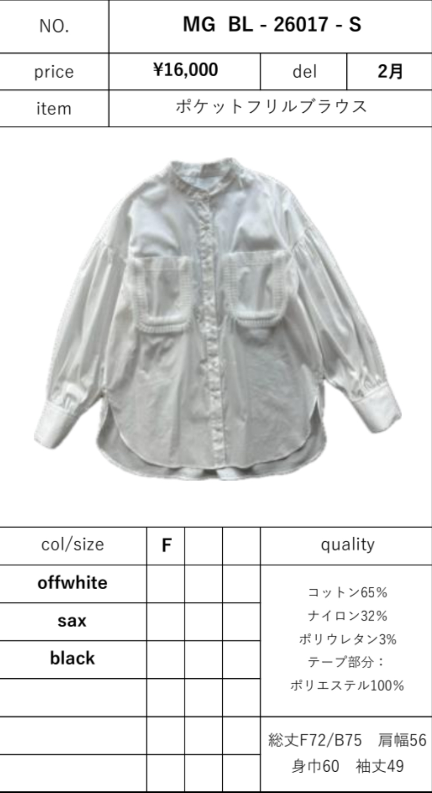 ポケットフリルブラウス 予約商品 ポケットフリルブラウス (MGBL-26017-S) 2026年2月デリバリー予定 他の商品とは別々にご購入ください キャリア決済でお支払い頂いた場合は商品入荷後、再購入での手続きが必要な可能性がございます クレジットカードでお支払いいただけますと幸いです カラー offwhite sax black 在庫状態 : 購入可能 ¥17,600(税込) 只今お取扱い出来ません 数量