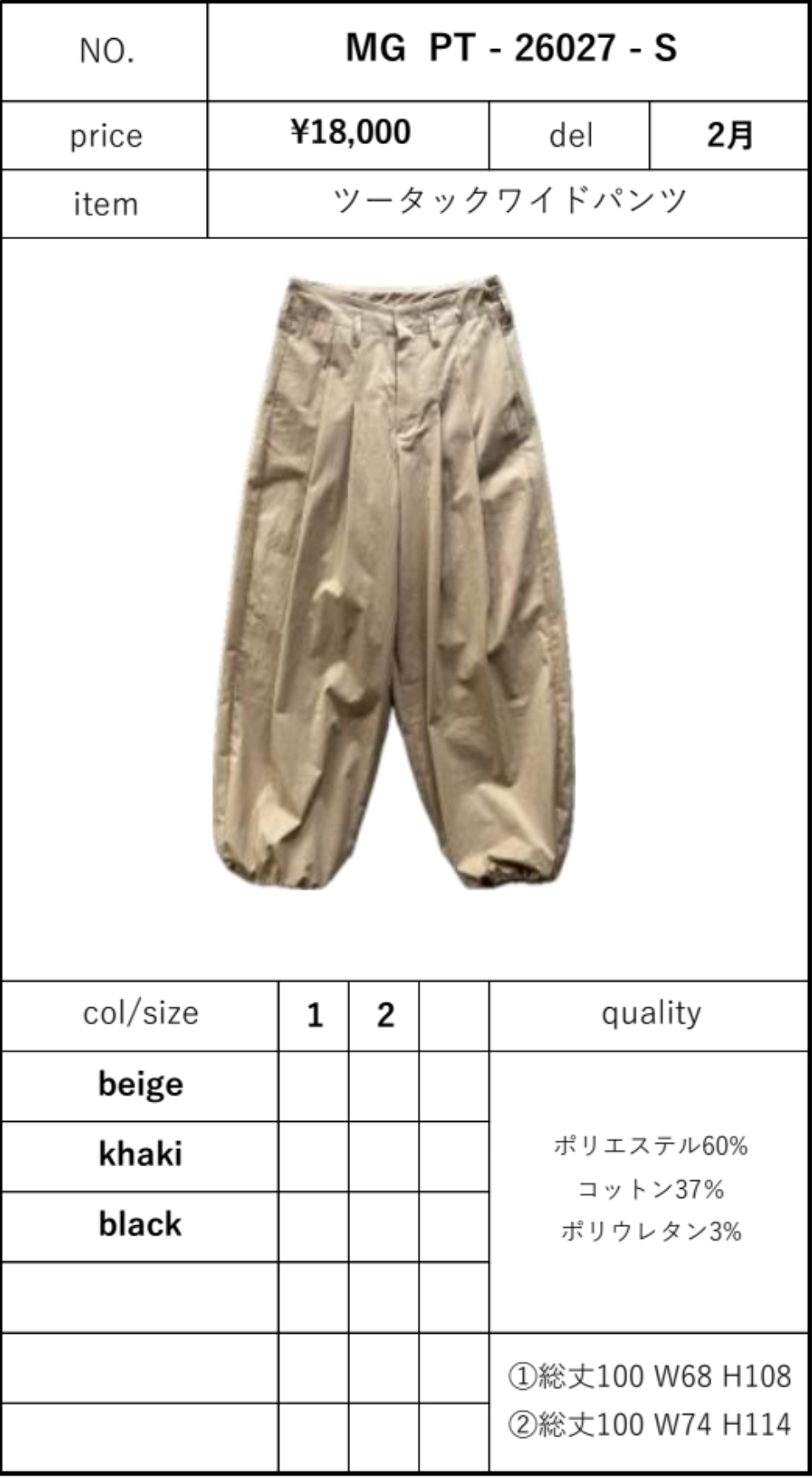 ツータックワイドパンツ 予約商品 ツータックワイドパンツ (MGPT-26027-S) 2026年2月デリバリー予定 他の商品とは別々にご購入ください キャリア決済でお支払い頂いた場合は商品入荷後、再購入での手続きが必要な可能性がございます クレジットカードでお支払いいただけますと幸いです beige khaki black 1(M) 2(L) 在庫状態 : 購入可能 ¥19,800(税込) 只今お取扱い出来ません 数量