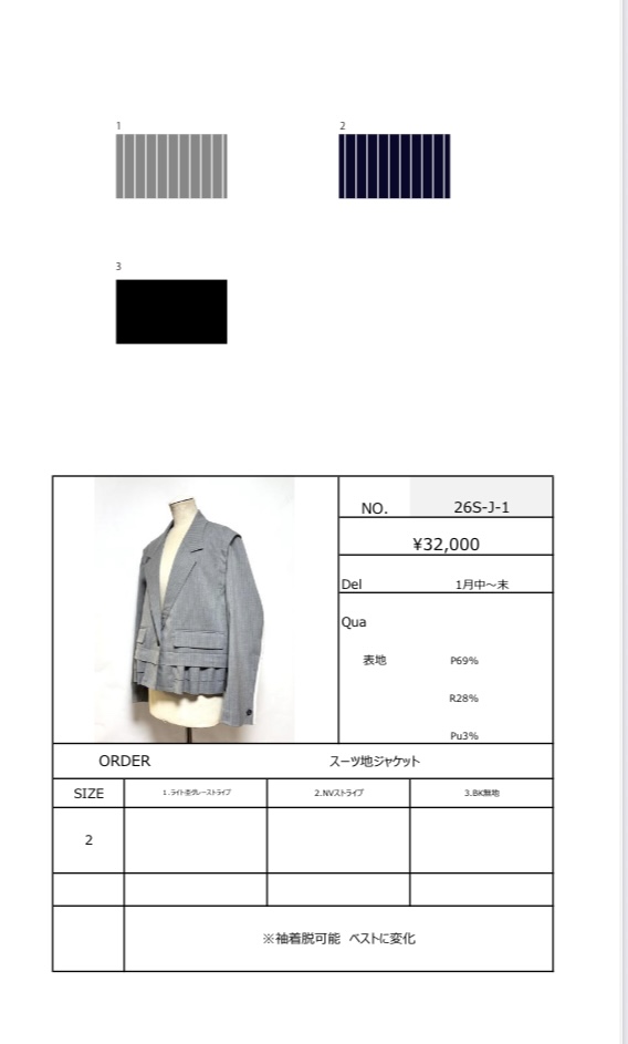 スーツ地ジャケット 予約商品 スーツ地ジャケット (26S-J-1) 1月末デリバリー予定 着丈 約54センチ 身幅 約59センチ 袖着脱可能 ベストに変化 他の商品とは別々にご購入ください キャリア決済でお支払い頂いた場合は商品入荷後、再購入での手続きが必要な可能性がございます クレジットカードでお支払いいただけますと幸いです カラー ライト杢グレーストライプ NVストライプ BK無地 在庫状態 : 購入可能 ¥35,200(税込) 只今お取扱い出来ません 数量