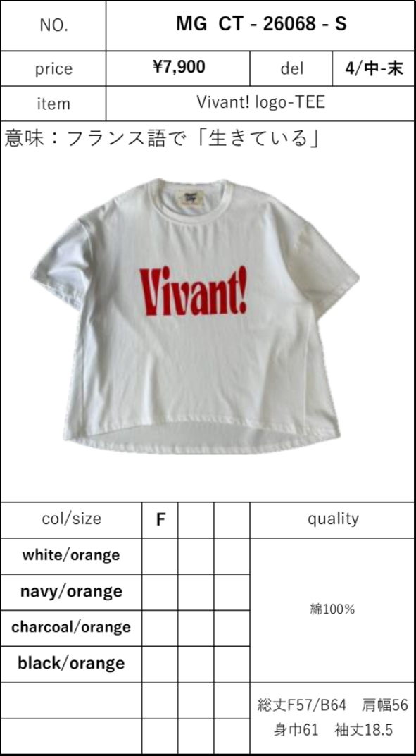 Vivant logo-TEE 予約商品 Vivant logo-TEE (MGCT-26068-S) 4月末デリバリー予定 (デリバリーは前後する可能性もございますのでご了承ください) キャリア決済でお支払い頂いた場合は商品入荷後、再購入での手続きが必要な可能性がございます クレジットカードでお支払いいただけますと幸いです 他の商品とは別々にご購入お願い致します カラー white/orange navy/orange charcoal/orange black/orange 在庫状態 : 購入可能 ¥8,690(税込) 只今お取扱い出来ません 数量