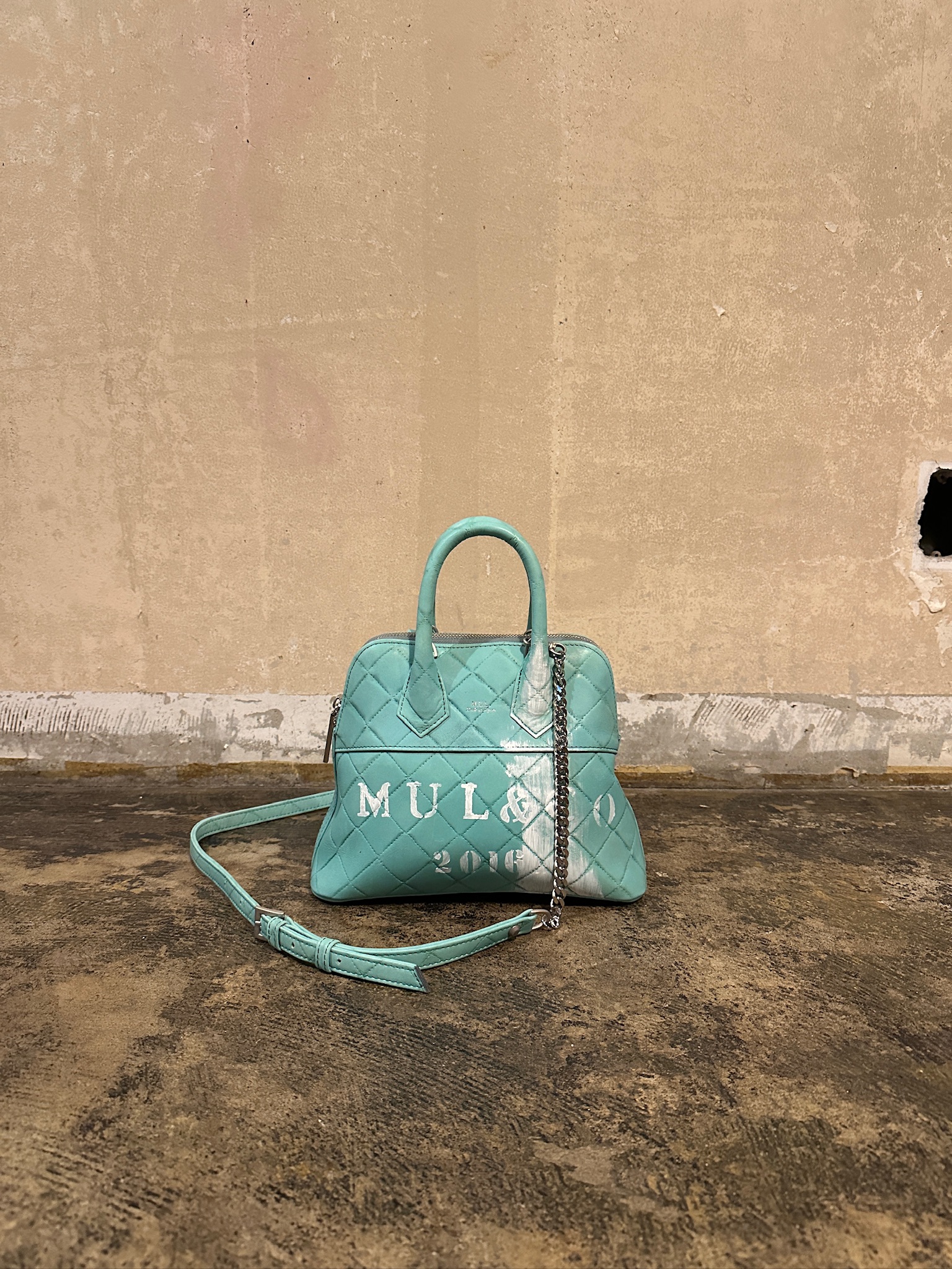 MUL078 ROUND TOTE S 淡青緑 キルティング型押し ペイント加工 チェーンショルダー